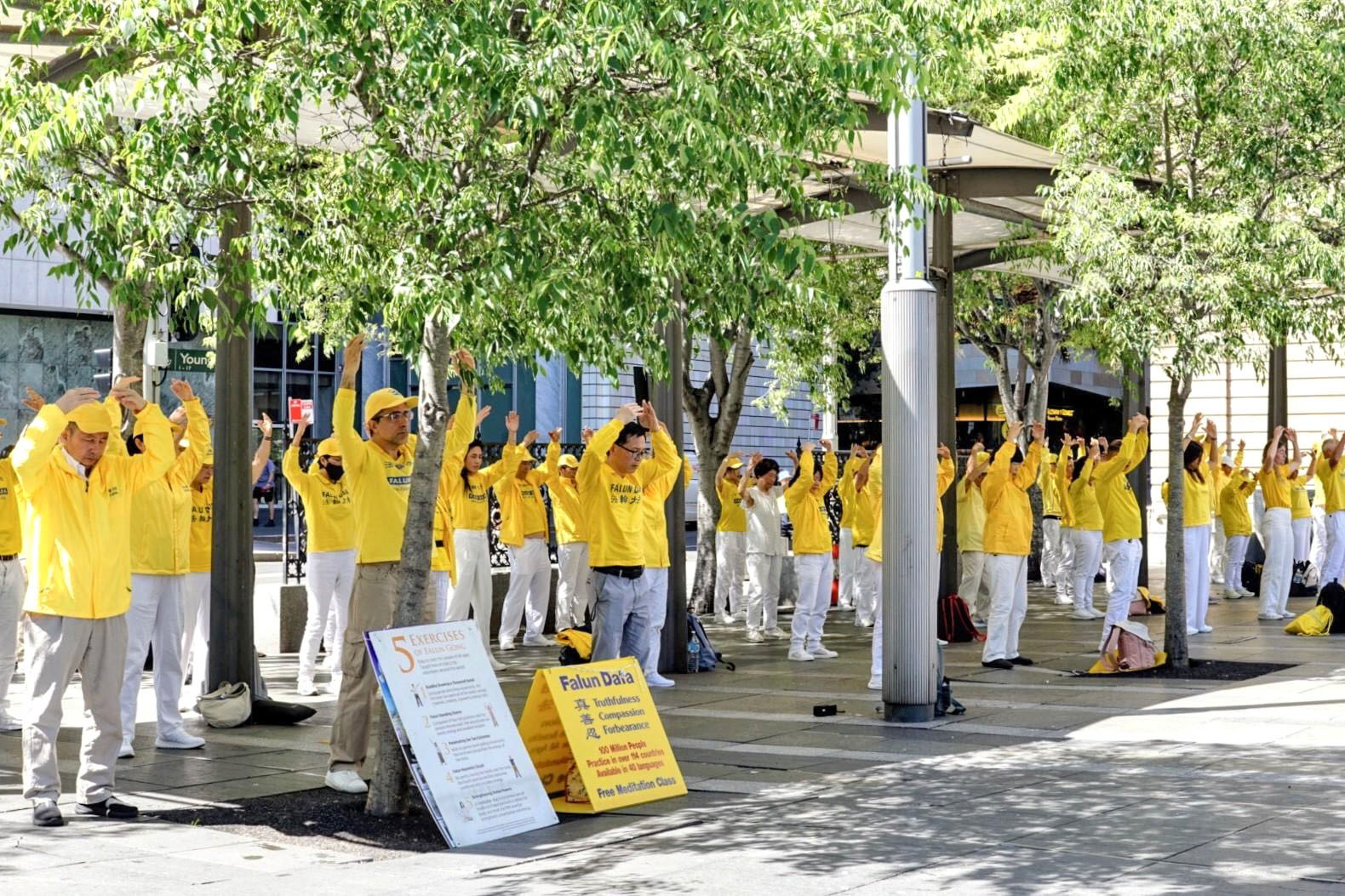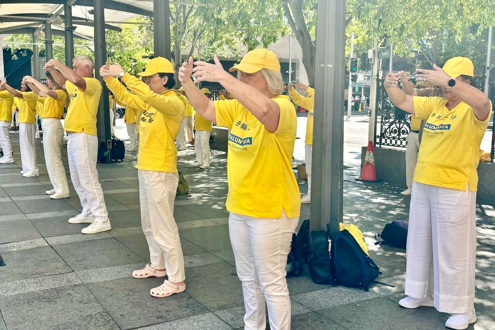 在海关大楼广场举办讲真相活动的前一天,法轮功学员在悉尼马丁广场(Martin Place)举行了大型集体炼功活动,并在市中心进行了盛大游行,当天的活动吸引了大量市民游客观看。