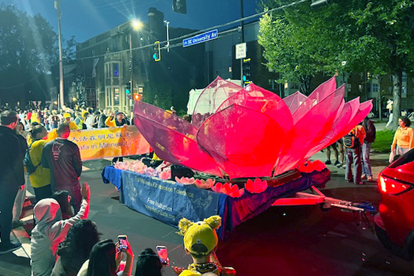 华灯初上,返校日游行于傍晚六點半开始。法轮功俱乐部队伍在优雅的《普度》音乐声中缓缓前行,巨大的粉色莲花花车上,身着汉服的小女孩和唐装的仙女热情的和观众招手,花车前后有俱乐部成员拉着法轮功的横幅,花车两旁还有学员给沿街观众赠送小莲花和书签。俱乐部成员们美丽祥和的姿态受到了沿街观众的赞叹。