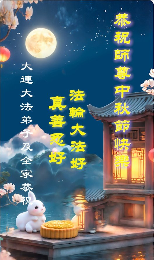 我们大法弟子携家人和明真相的世人恭祝师尊中秋节快乐!师尊辛苦了!谢谢师尊的慈悲苦度!弟子一定破除旧势力的安排,消除间隔,形成强大的整体,反迫害,救度众生。弟子们要多学法,学好法,发好正念,向内找,兑现自己的誓约,跟师父回家。
