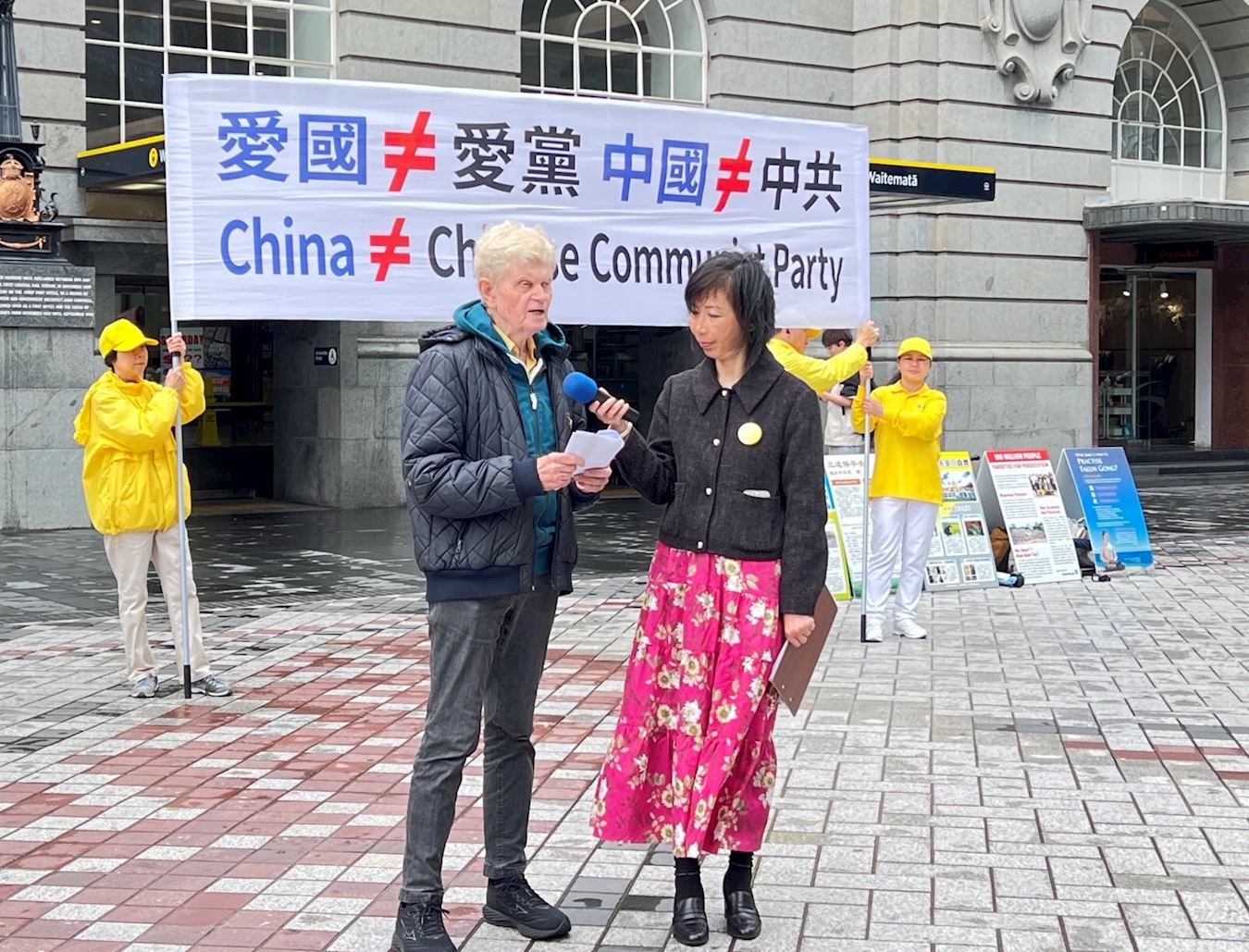 前奥克兰公民自由委员会(Auckland Council for Civil Liberties)主席巴里·威尔森(Barry Wilson)发表讲话,强烈声援法轮功学员长期以来揭露中共人权迫害的努力,并再次呼吁国际社会关注持续二十六年的暴行。