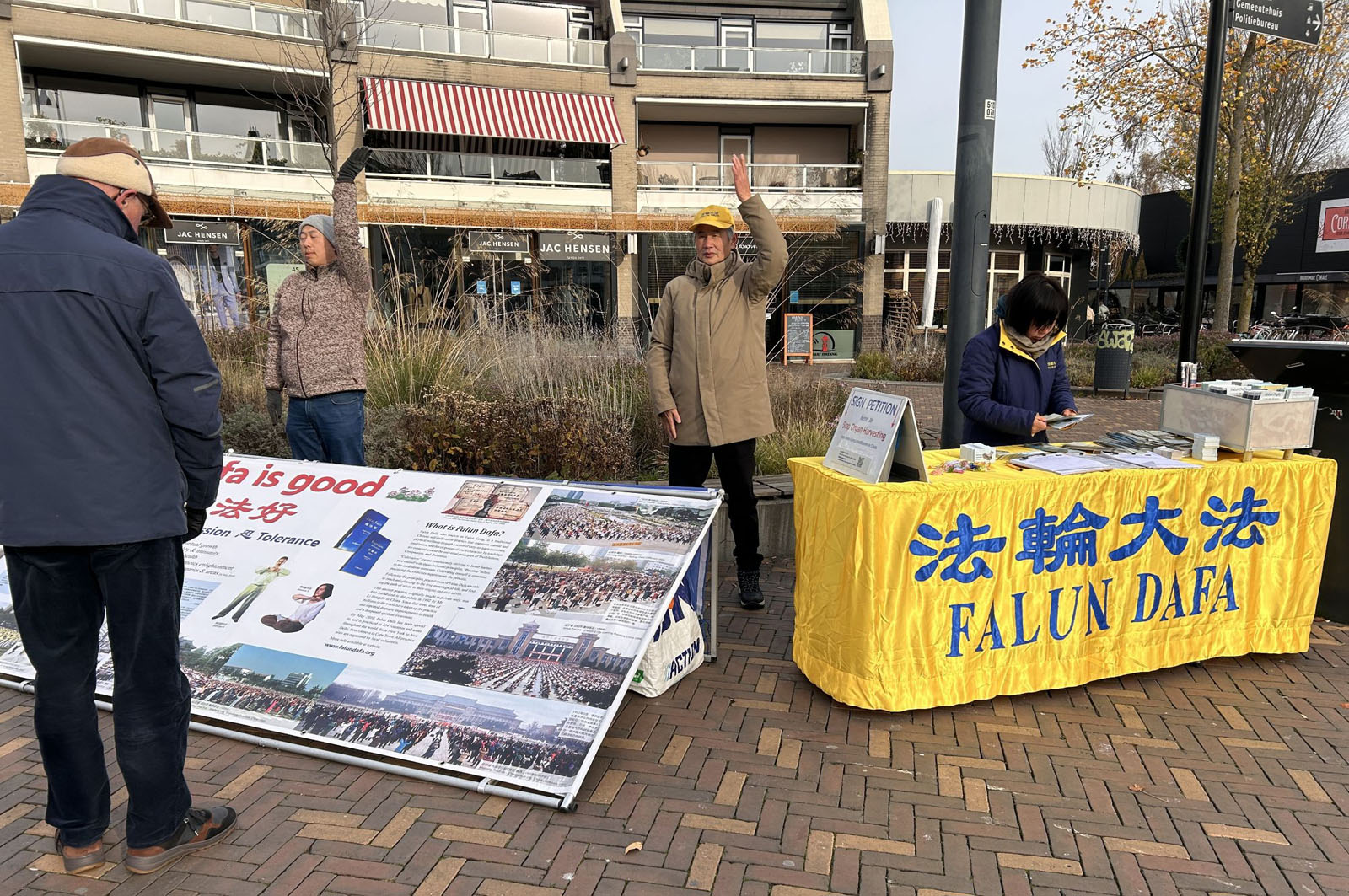 二十二日中午,法轮功学员们在费嫩达尔的高街(Hoogstraat)布置法轮功真相展板,演示法轮功五套功法,向路人发送传单,讲述法轮功在中国遭遇中共长达二十六年的迫害。人们在反对中共活摘法轮功学员器官的征签表上签名,支持法轮功反迫害。
