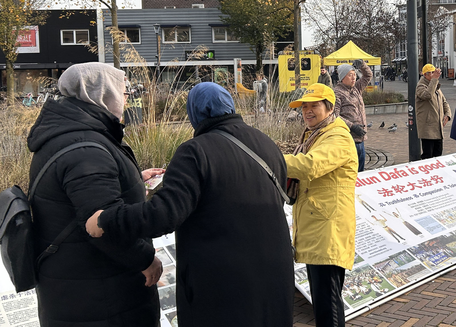 她看到法轮功学员的功法演示,很感兴趣,学员送给她传单,建议她多多了解法轮功,她很高兴地接受了。