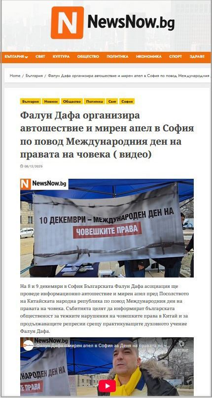 保加利亚网络媒体(NewsNow.bg)记者报导了这一活动,报导中说:“索非亚的这个活动旨在让这些迫害被广泛知晓,并呼吁国际机构和各国政府谴责在中国发生的反人类罪行。(法轮大法)学会强调,(法轮大法)这一功法的修炼原则——真、善、忍是他们和平行动的核心。”