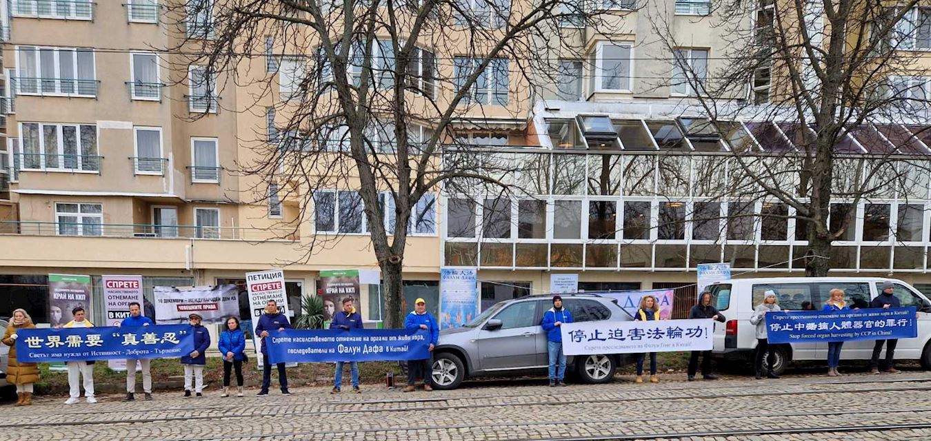 二零二五年十二月九日,学员们于上午十点至中午十二点在索非亚的中共大使馆前举办和平抗议活动。