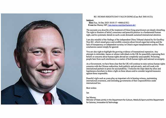 国际人权日当晚,英国法轮大法学员举行了烛光守夜和和平反迫害活动。英国国务大臣伊恩·默里致函表示支持法轮功。