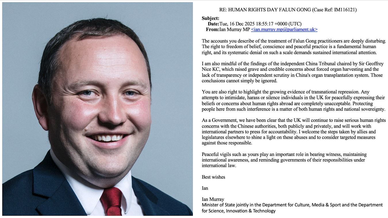 伊恩·默里国务大臣首先对法轮功学员所遭受的迫害表达了关切。他表示:“你所描述的对法轮功学员遭受虐待的情况令人深感不安。信仰、良知以及和平修炼的自由是一项基本人权,而如此大规模、系统性地剥夺这一权利,理应引起国际社会持续的关注。”