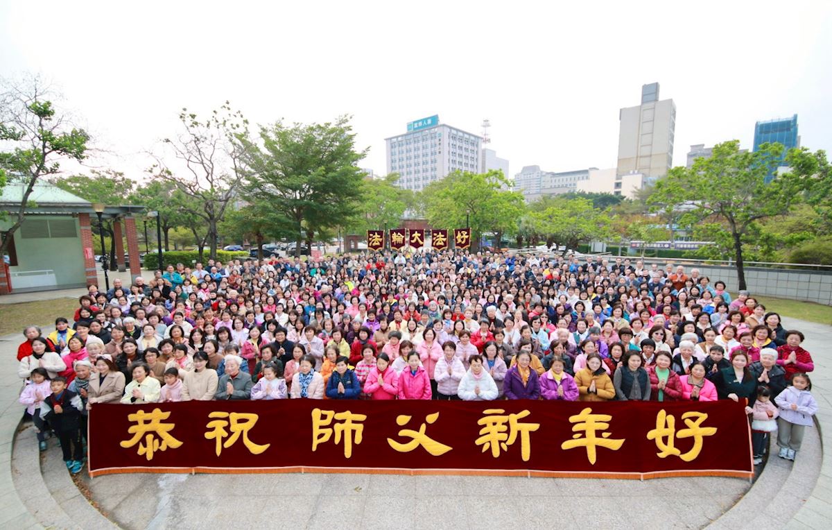 '图1:桃竹苗法轮功学员齐聚于竹北市文化公园,向慈悲伟大的师父恭祝新年快乐。'