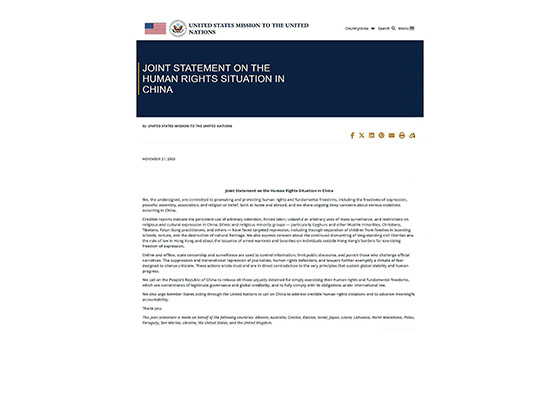 十一月二十一日,美国等十五个联合国成员国发表关于中国人权状况的联合声明,谴责中共有针对性的迫害维吾尔族和其他穆斯林少数群体、基督徒、藏族、法轮功修炼者等群体,敦促各成员国推进有意义的问责。