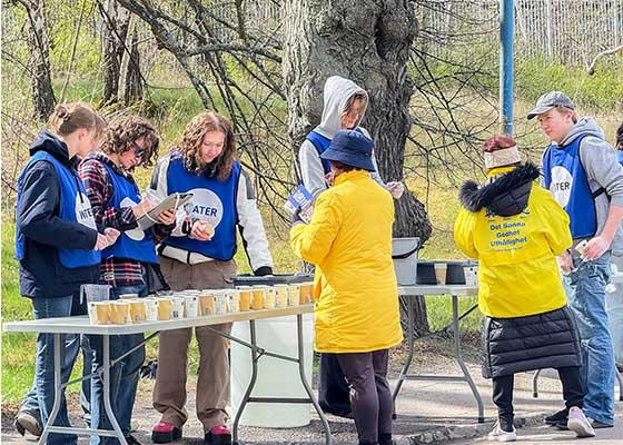 四月二十六日,为纪念四·二五法轮功学员和平上访二十六周年,瑞典部分法轮功学员在斯德哥尔摩中使馆前举行了集体炼功、讲真相活动。