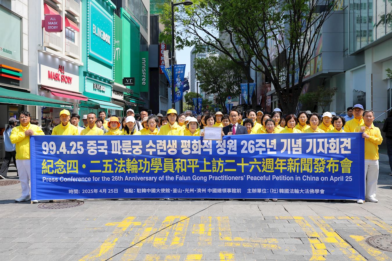 【明慧网二零二五年五月一日】二零二五年四月二十五日,韩国法轮功学员在首尔明洞的中国大使馆及釜山、光州的中国总领事馆前举行了记者会,纪念一九九九年在北京中南海附近的国务院信访办和平上访二十六周年。