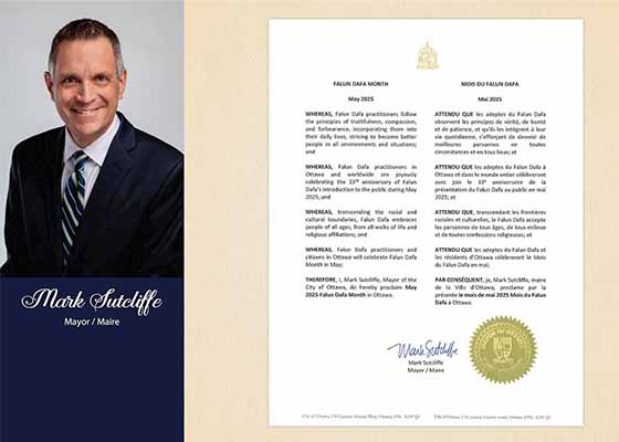 法轮大法传世三十三周年之际,渥太华市长马克﹒萨特克里夫代表市议会宣布五月为“渥太华法轮大法月”。