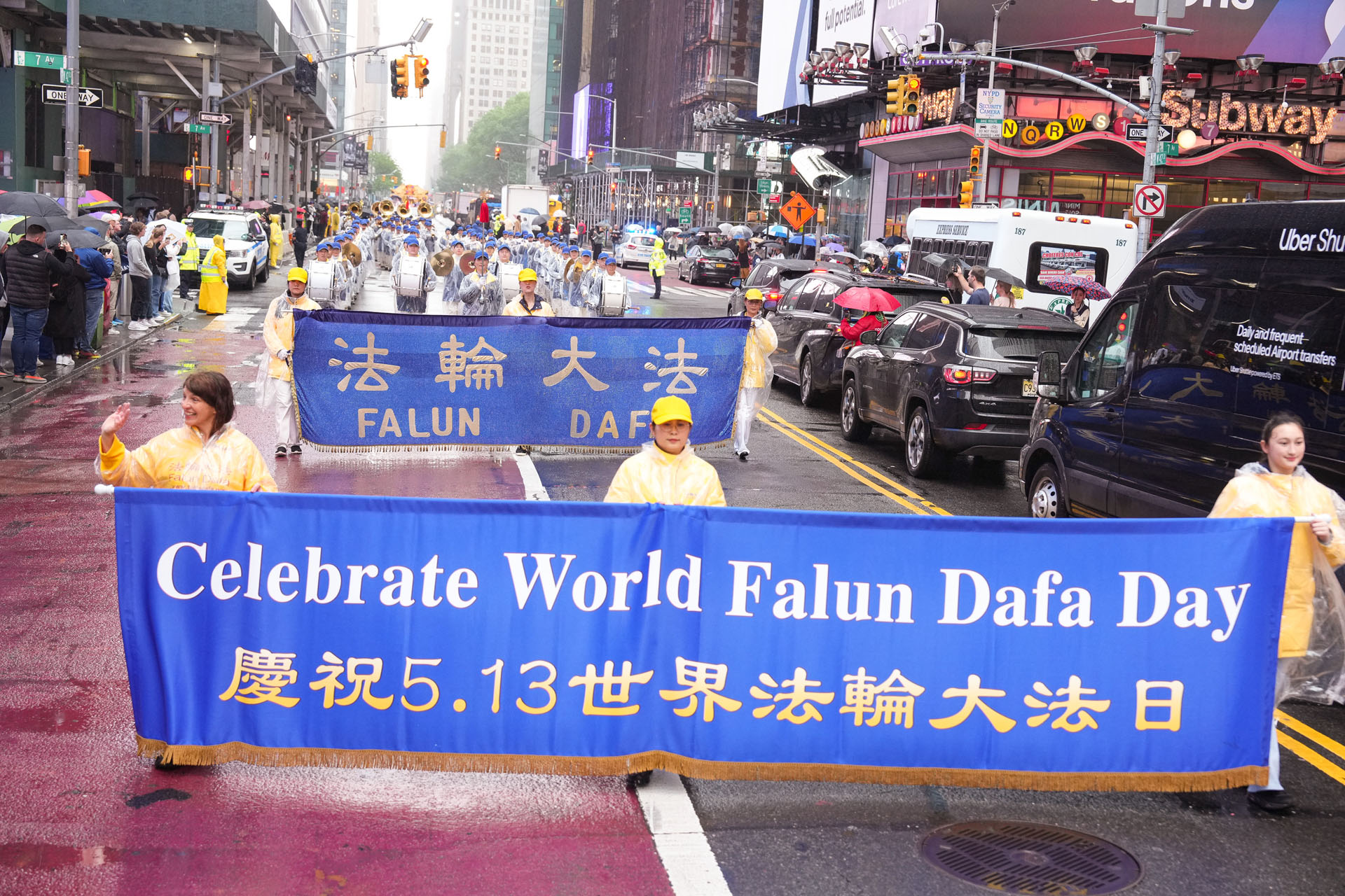 二零二五年五月九日星期五,在纽约的曼哈顿中城,数千名法轮功学员举行了盛大游行,庆祝世界法轮大法日。春雨连绵,滋润万物,各族裔法轮功学员冒着风雨,表达对真善忍的庆祝,对法轮大法创始人的感恩,与这个世界分享大法修炼的美好。