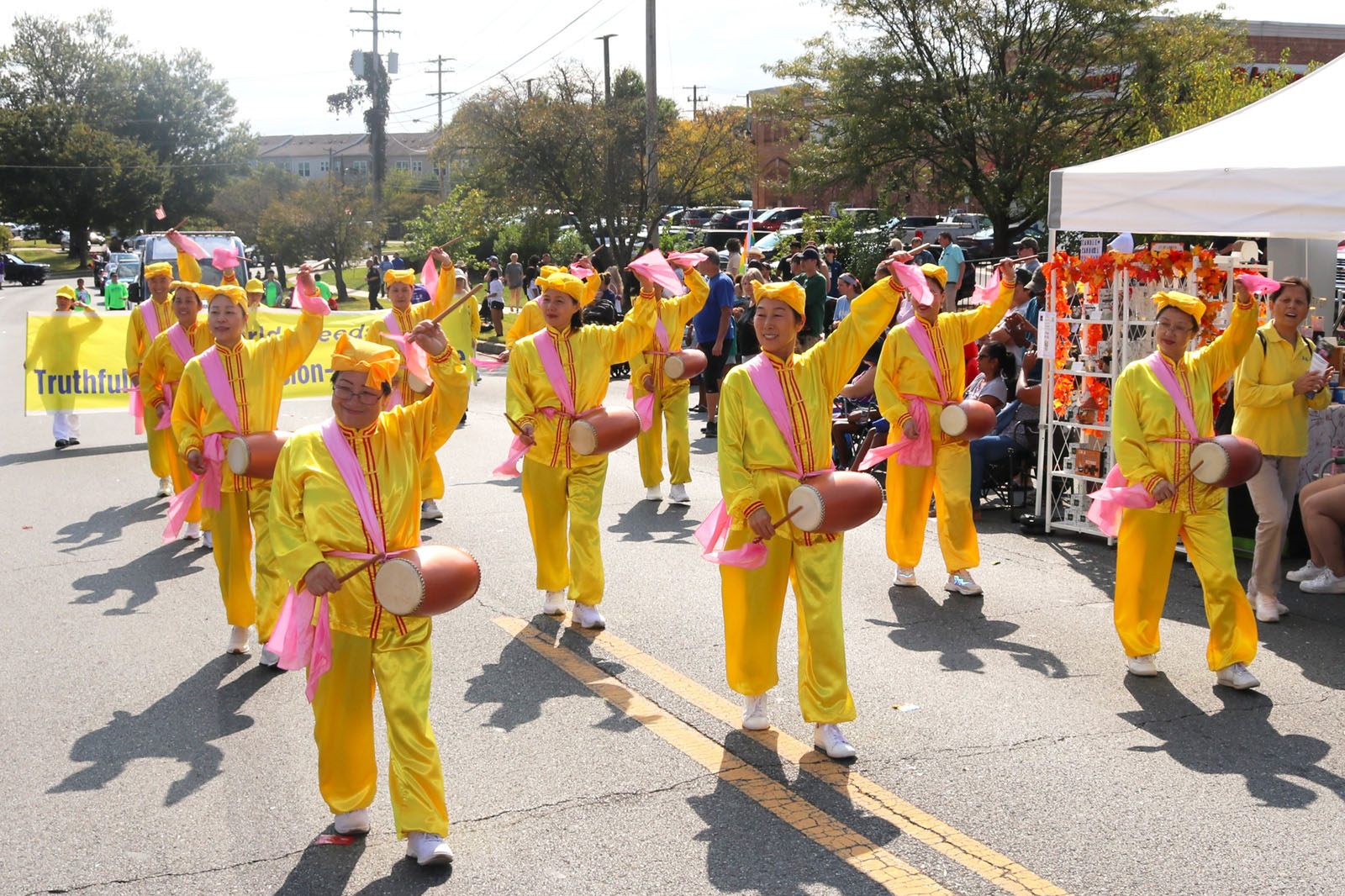 法轮功学员的真相车队和腰鼓队参加了游行,沿途街道两侧观看游行的人们为他们鼓掌喝彩。