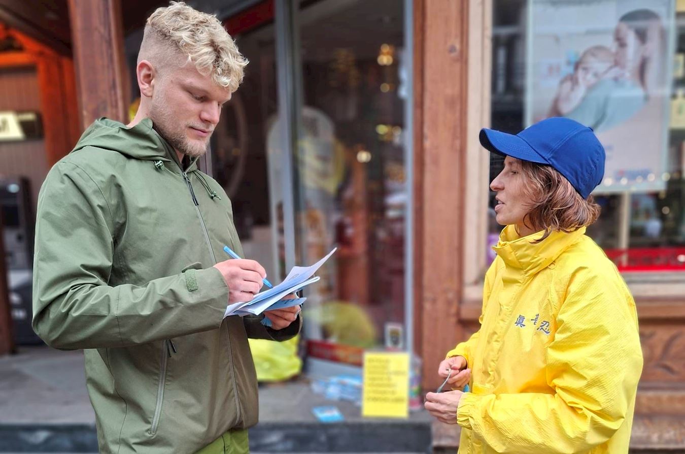 来自波兹南(Poznan)地区的年轻游客拉多斯瓦夫•贾兹(Radosław Jaz)和他的朋友们都停下来询问关于活摘器官的真相。他们震惊地了解到,在中国法轮功学员仅仅因为遵循“真、善、忍”的原则就被关进监狱并被活摘器官。“这是无法接受的犯罪行为”,他和朋友们都在征签表上署名,以示对中共的强烈抗议。