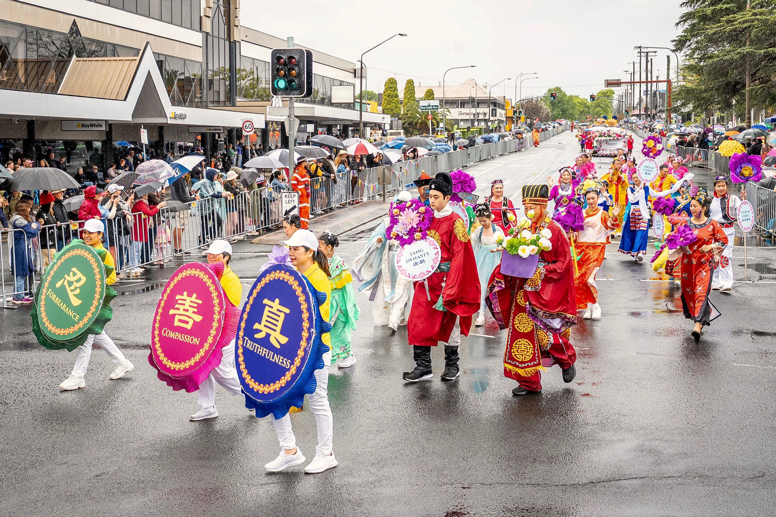 法轮功学员的方阵以超凡脱俗的光彩与祥和赢得了沿途数以万计民众的欢迎。沿途设有九个高音喇叭讲解台,昆士兰ABC新闻主持人珍妮·伍德沃德(Jenny Woodward)向观众介绍:“接下来我们将看到法轮功社区的表演,这是他们的天国乐团——一支由修炼法轮功的音乐家组成的铜管木管乐队。”