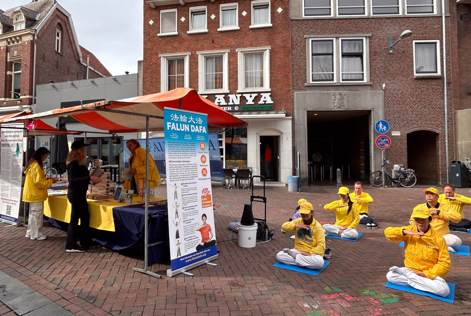 星期日中午,法轮功学员在罗森达尔市花卉市场(Bloemenmarkt)设置展位,向游客介绍法轮功的功法动作,发放传单,并揭露中共迫害法轮功真相,征集支持反迫害的签名。许多民众被吸引,有人静静地观赏;有人跟着学习炼功动作;也有人在了解真相后签名支持法轮功学员反迫害。