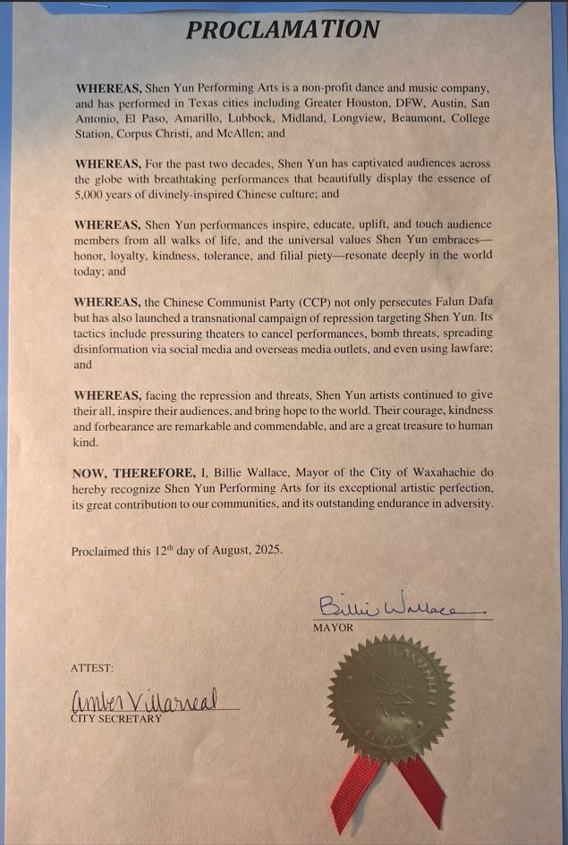 【明慧网二零二五年九月九日】二零二五年八月十二日,美国德克萨斯州中部城市瓦克萨哈奇市(Waxahachie)的市长比莉· 华莱士颁发褒奖书,赞扬神韵艺术团的艺术家们在中共跨国镇压下,依旧展现出过人的勇气和坚韧不拔的信念,把他们美好的艺术和价值奉献给社区。这给世界带来希望,是人类的宝贵财富。