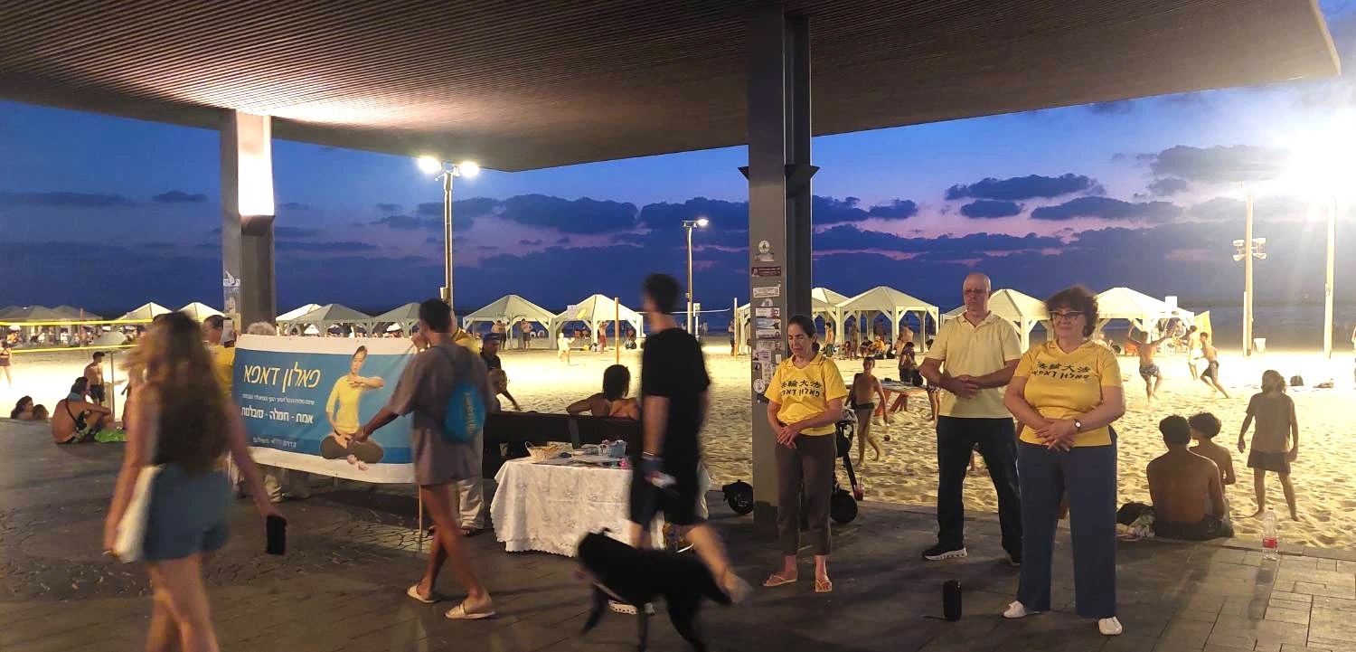 活动从下午六点持续到八点半,学员们演示功法、发放资料并征签反对活摘器官等。许多以色列民众驻足了解真相,在征签表上签名。
