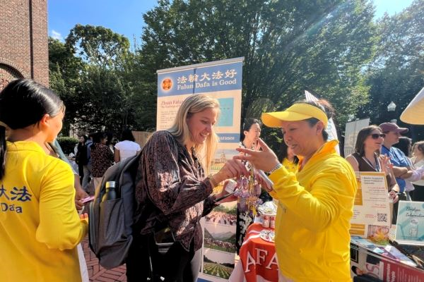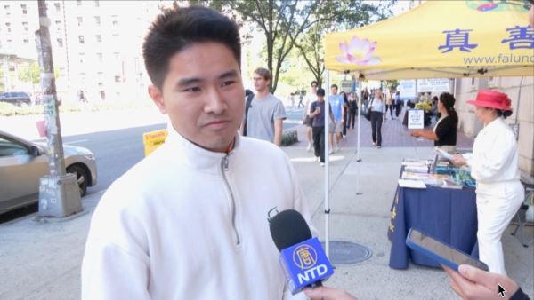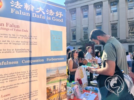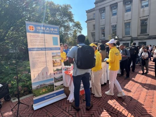 一名叫明的中国留学生接过了法轮大法的简介。法轮功学员向他介绍了中共在国内的残酷迫害和中共在国外企图输出跨国镇压的真相后,他表示不喜欢中国封闭的环境,喜欢美国自由的氛围,他登记了联络信箱,并希望法轮大法学社能更多的接触在哥大读研究生的中国大陆留学生。