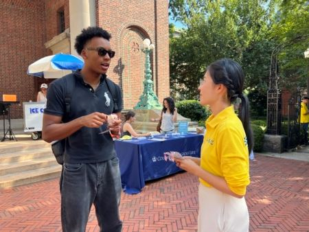 活动期间,法轮功学员在校外真相展位帮助中国留学生解决签证困境,吸引学生路人驻足。在哥伦比亚大学开学返校日当天,“全球退党服务中心”特地到场,希望协助中国留学生应对当前签证挑战。退党中心的工作人员表示,留学生遭遇的困境根源不在学生个人,而在于中共政权。中国学生若能声明自己与中共无关,将更容易获得美国政府及社会的信任。