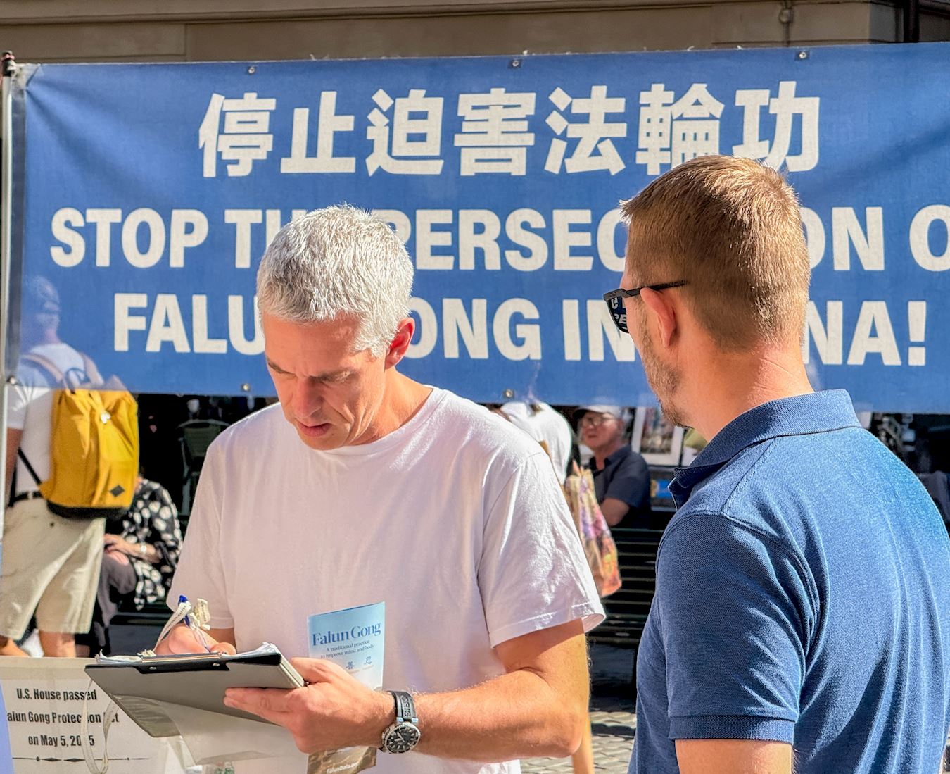 一对父子在征签表上签了名。父亲说:“这正是我们现在需要的:真、善、忍。我们已经厌倦了分裂、仇恨和争斗,我们不再需要这些了。”