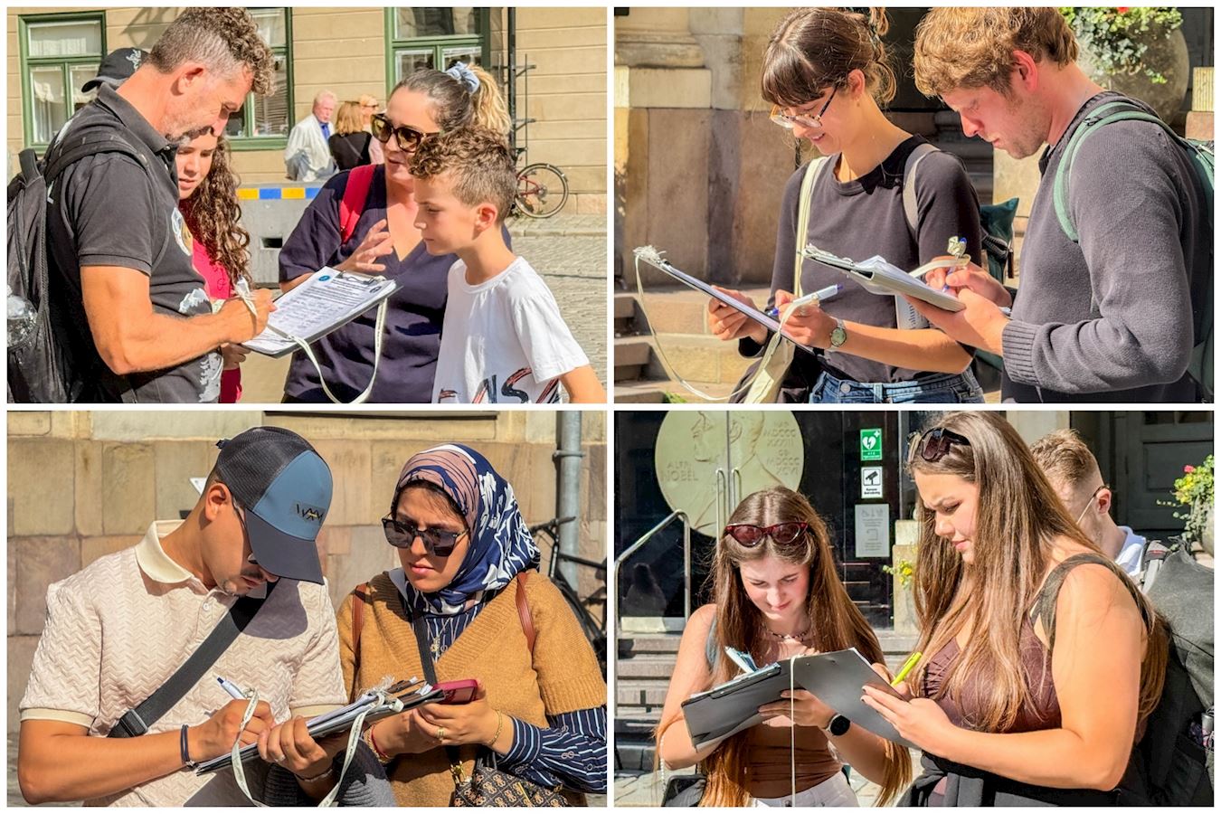 二零二五年九月五日和七日的下午,法轮功学员在诺贝尔博物馆前的真相摊位还没有完全摆放好,许多当地市民和游客就围上来想了解详情,人们都主动接真相资料、观看信息展板或与学员交谈,很想进一步深入了解法轮功,以及中共迫害法轮功的真相和有关活摘器官的资讯。人们明白真相后都主动接过签字簿来签名,表示很愿意为结束迫害助一臂之力。