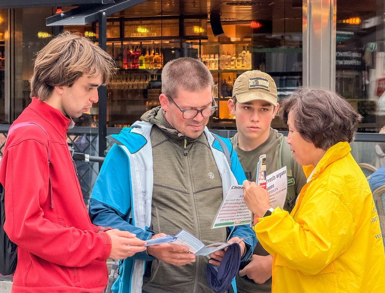有两位大陆年轻人经过活动场地时,开始时不愿意接学员递上的资料,显然他们都受到了中共的毒害。但其中的一位高个的年轻人还是停下来脚步,站在了真相展位前,与法轮功学员聊了起来。他说当他看到北京阅兵式上习近平与普京,在谈论器官移植延长寿命的内容,的确很惊讶。他还表示在这里看到法轮功公开的炼功,发资料,特别的震惊,因为自己对法轮功的了解都是中共官方宣传报道的。