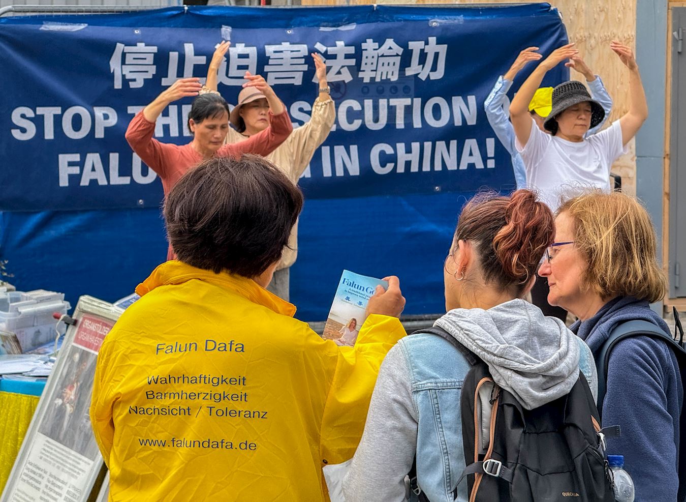 一对年轻男女走近另一位学员,男青年说自己知道法轮功的事情,还希望同伴也能听到真相。