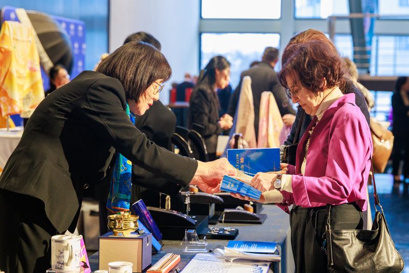'图1:二零二六年二月九日下午,美国神韵纽约艺术团在德国首都柏林德意志歌剧院(Deutsche Oper Berlin)上演了今年当地的第二场演出。图为观众对法轮大法书籍很感兴趣。(大纪元)'