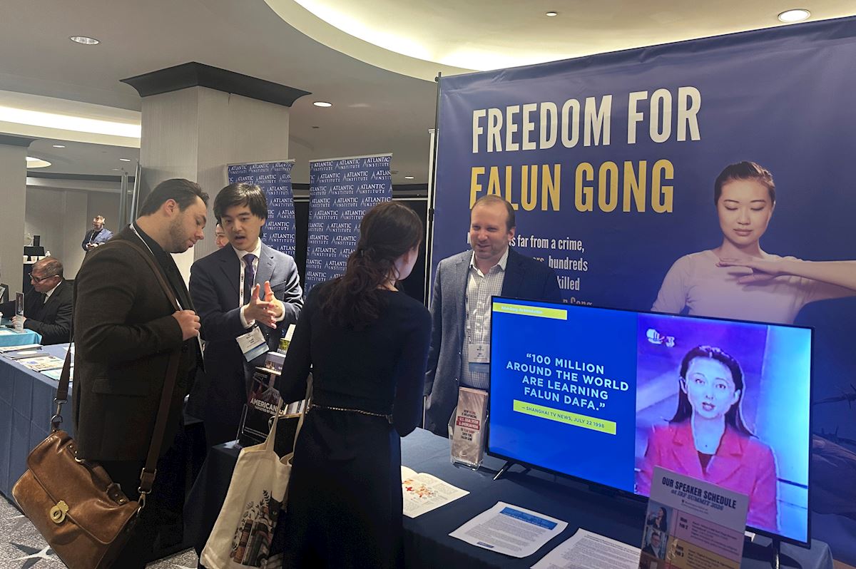 二月二日和三日,在希尔顿酒店大厅,法轮功学员设立展位,电视画面中展示法轮大法的真相,以及过去二十六年来中共对法轮功的残酷迫害。与会者在展位前停下脚步,了解法轮功。一些人表示以前从未听说过法轮功及其遭受中共的迫害,他们感谢法轮功学员在峰会上唤起人们对这场迫害的关注。