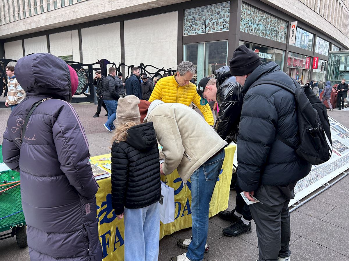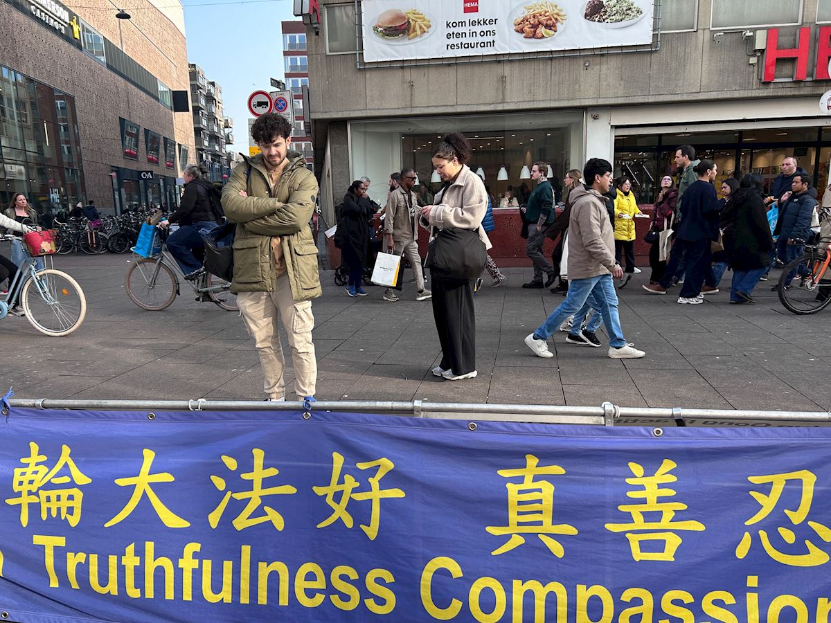 一位海牙市民静静的看着展板上关于法轮功五套功法的介绍,又专注地看法轮功学员的功法展示后,上前询问。他表示,“法轮功学员们很平静,与街上喧嚣的人流形成了鲜明的对比。”当得知这样一个平和的修炼团体已经在中国大陆被镇压近二十七年,他立即签名支持学员们反迫害。离开真相点没多久,他又走回来静静的阅读法轮功学员在中国遭受迫害的展板,学员向他介绍海牙义务教功的地点,他很有兴趣,表示要去尝试一下。