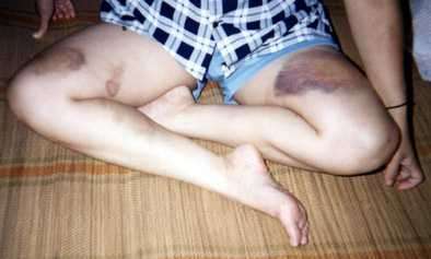 照片上的伤痕是8天后拍的,大部分的肿块都消下去了,留下的痕迹颜色也很淡了,有些地方也没有拍。据说刚回家时,身上被打得青紫交加象地图一样,青岛的打手说:“反正不是我们这儿的人,打死就打死。”