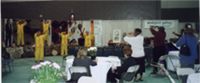 我们把四副大型图片布置好之后,2位弟子开始随着悠扬的大法音乐炼功。另3位弟子分站在不同的路口发资料。不到3小时,发出近千份资料。
