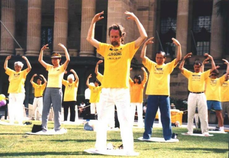 从下午二时至四时,来自昆省各地的近七十名法轮功学员,身穿醒目的黄色T恤衫,排着整齐的队列随着英文解说和祥和的大法音乐向游人过客演示了法轮功的五套功法。场地周围悬挂着印有“法轮大法好”“真-善-忍”字样的横幅和彩球,并陈列着有关法轮大法及在中国境内邪恶势力对无辜法轮功学员残酷镇压迫害的图片和资料。场地上的气氛庄严祥和,与都市中心的繁华热闹形成鲜明的对比,格外引人注目。不少游客停下步来聆听解说,观看学员们的演示;携带照相机的纷纷拍照留念;有的游客干脆拾阶而坐,聚精会神地从头看到尾。中间休息时,一些游人主动向学员们询问功法,索取资料;还有两三个行人被眼前的场景深深感动,当即加入了学员们的行列,第二天又前往新农场(New Farm)的炼功点继续学法炼功。