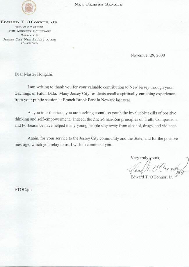 参议员Edward O'Connor, Jr.先生在嘉奖令中写道:“新泽西州第31选区的全体人民通过他们的当选代表,对李洪志大师坚持把法轮大法作为社区人民朋友的传统及响应人民在精神指导,善良和友好等方面的需要予以嘉奖和赞扬。”