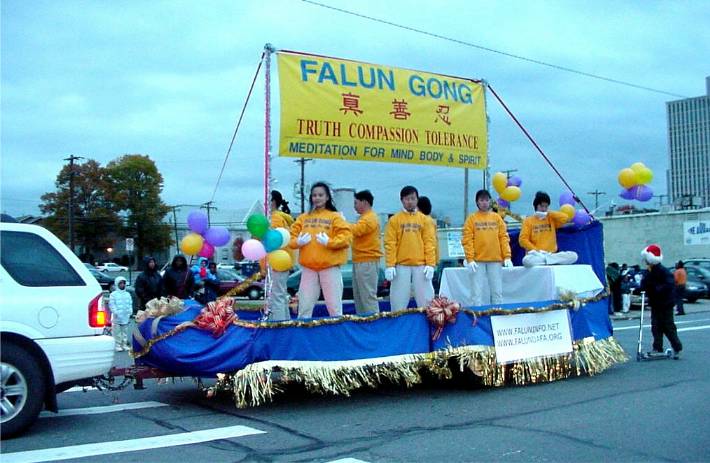 游行是下午四点钟开始,我们一点半就赶到现场装饰游行彩车,做准备工作。当天气温较低,风也很大,许多学员没有穿足够的衣服,感觉很冷,可是大家心里热呼呼的。在寒风中学员们一起动手,很快就将我们的彩车装饰完毕,真、善、忍黄色的条幅格外引人着目。大家穿着浅色裤子,黄色的大法T恤衫。在彩车上有六个学员展示动功,二个学员展示静功。四个学员在两边沿路分发洪法和讲清真相的资料,四个学员在彩车前打大法横幅,二个学员负责开车,音响和在车上向外递送材料,另两个学员负责联络和协调整个游行队伍。虽然天气阴冷,但是道路两边早早就聚集了很多观众。在四十分钟的游行路上,有不少观众向我们问候,念着条幅上的“真、善、忍”和“法轮大法”。我们的大法资料很受欢迎,在四十分钟的游行过程中发出了一千多份大法材料,帮助许多善良的美国人民了解大法真相。