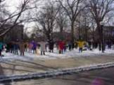 参加2000年五大湖法会的中西人法轮功学员在密歇根大学交流修炼心得、举办烛光守夜及集体炼功。