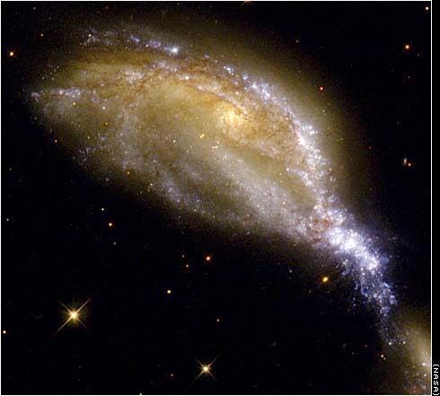 哈勃空间望远镜图象的中心,沿着巨大螺旋银河系的顶端和右边缘,明亮的蓝白光纹标志出一个较小银河系通过的踪迹。