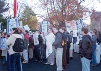 约下午3点钟,大家乘两辆大轿车抵达中国使馆。莫恩议员进使馆递交呼吁信,声明赵明是无罪的,呼吁中国政府尽早释放他并让他回爱尔兰完成学业。大家举着写有英文“Free Zhao Ming(还赵明自由)”、“Release Zhao Ming(释放赵明)”、“Let Him Go Today(立即放人)”等和中文“释放赵明”、“还赵明修炼法轮功的自由”的标语横幅,在使馆前抗议。参加使馆前集会的有一百多人,除学生外,有社会上从头一天《爱尔兰时报》上看到消息而来支持的,还有从另一城市Cork赶来支持的,还有几个十多岁的小学生也来支持,并坚持到最后。据Trinity学生会的负责人讲,这是他们一年来参加人数最多的一次活动,就连以前为学生争取助学金的集会都没有这么多学生参加。有的学生是下午自己骑自行车来的。