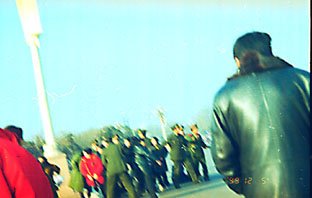 十几名法轮功学员一起坐在国旗西侧集体打坐炼功。广场上的巡警看到后,和周围的几十名警察及便衣迅速赶到了现场,一辆警车也冲了过去,警察抓住炼功的学员强行向警车上推搡并驱赶周围的游客,特别对拿相机的人进行严密盘查,以防有人拍摄。