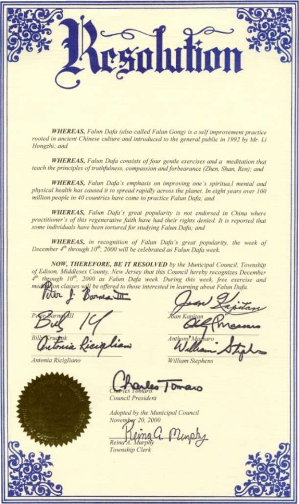 【明慧网2000年12月22日】 新泽西州爱迪生市议会通过“法轮大法周”的决议并在市议会上向大法弟子颁发决议。