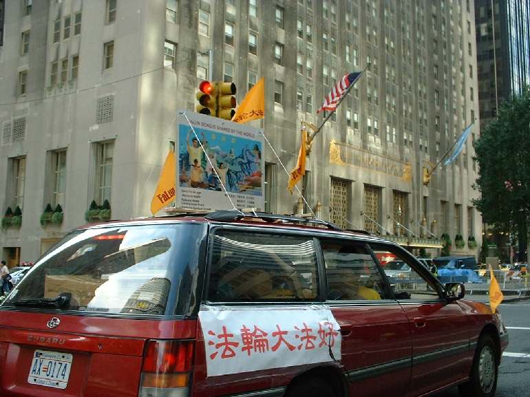 各国大法弟子在华尔道夫酒店附近等待VIP车队