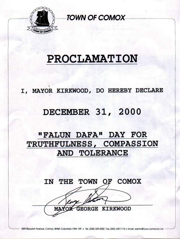 【明慧网2001年1月17日】 不列颠哥伦比亚省可摩克斯市宣布2000年12月31日为“法轮大法真善忍日”