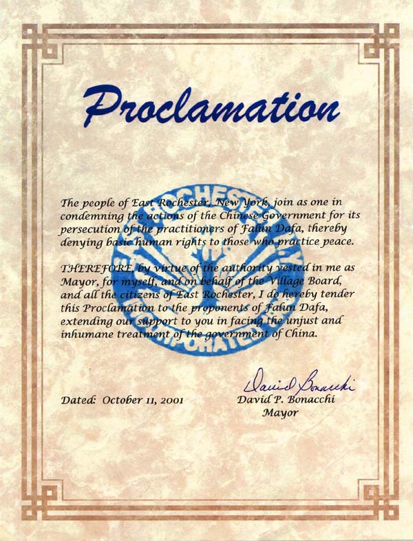 鉴于如此,本人履行被授予的市长职权,代表市委员会及全体东罗切斯特人民,特颁赠此褒奖给予法轮大法,为你们面对中国政府非正义和非人道的迫害表达我们的支持。