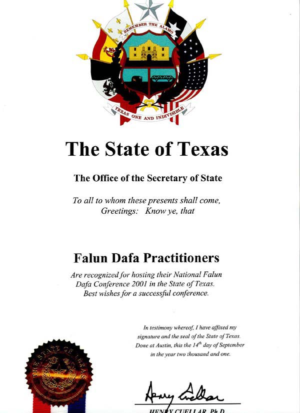 【明慧网2001年10月3日】得克萨斯州州务卿2001年9月14日嘉奖法轮大法,并祝德州法会圆满成功。