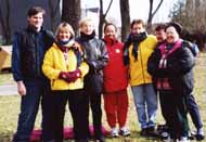 | 在BMLSS中学作完报告后与上课老师Bonnie(右2)及Kathy(左2)合影 | Parry Sound 市长Ted Knight在他办公楼前新闻发布会上与SOS步行人员合影 | Shawanaga印第安部落酋长John Geroux与SOS步行人员合影 |