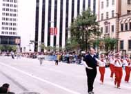 上午游行九点开始,约有六十一个团体参加,其中绝大部分是大公司;走在最前面的是警察骑马开道,市长候选人桑切斯坐在消防汽车上,以及欢乐队,接着是主办单位─华盛顿联合基金,紧接着是大乐队;后面竟然没有队伍,这时突然出现一个非常惊喜而戏剧性的场面:两位大法弟子身着“真、善、忍”的黄色套装,手持写有“法轮大法─真、善、忍”的大横幅,出现在游行队伍中,她们昂首挺胸,跟随乐队,踏着乐队的曲奏向前迈进,沿途获得市民们的鼓掌和喝彩;有些市民惊喜地用中文对大法弟子欢呼“你好。”