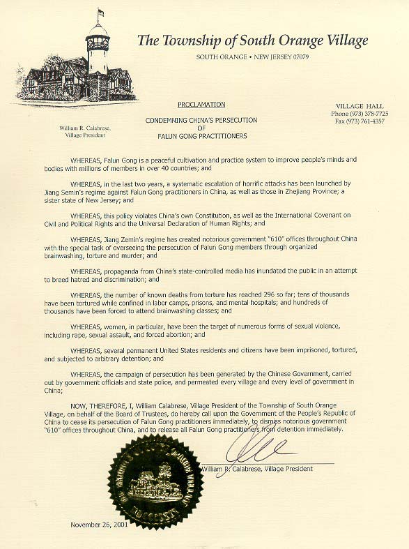 我,WILLIAM CALABRESE,南桔市(South Orange,NJ)市长,代表市议会:呼吁中华人民共和国(江泽民)政府立即停止对法轮功学员的迫害,撤销遍及全国的臭名昭著的“610”政府办公室,立即释放所有被关押的法轮功学员。