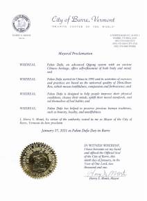 维蒙特州蒙特贝利尔市宣布“法轮大法周”和“李洪志日”
