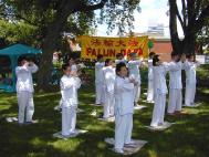 西人学员(60多岁)马克思站着发了一天报纸。他的腿里有钢钉(战争时受伤),“这么多人得闻法,我很高兴。”他说。简在我们炼功时在会场解说。她说这是去我怕心的。大家为他高兴。两天发生太多的故事。我们感到整个节日现场都在我们的场中。功友们演示时感到场很强。有位西人学员刚到公园门口就感受到强大的能量场。